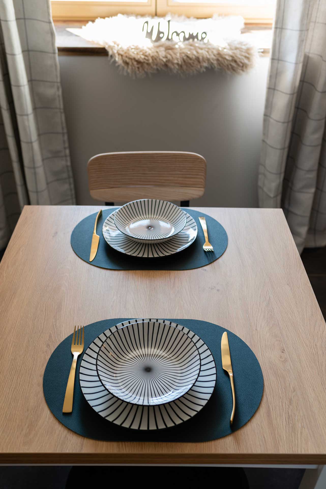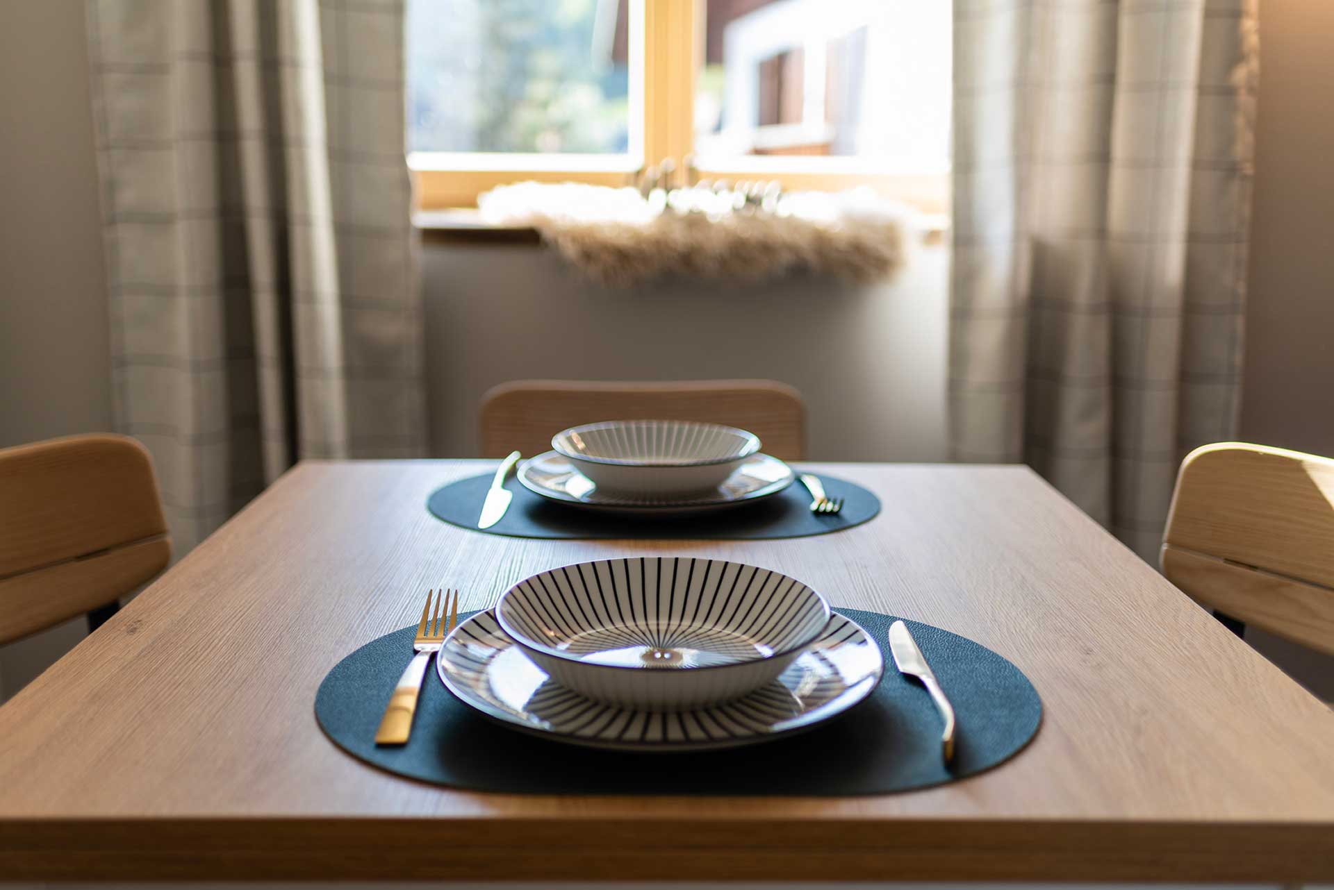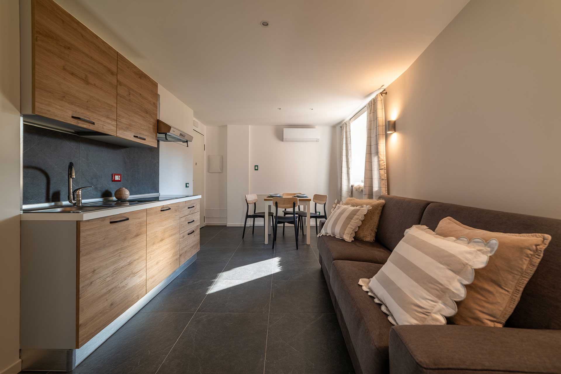 L’appartamento vanta pareti rivestite con legno antico, proveniente da storiche baite dell’Austria e dell’Italia, che conferiscono un’atmosfera calda e autentica.