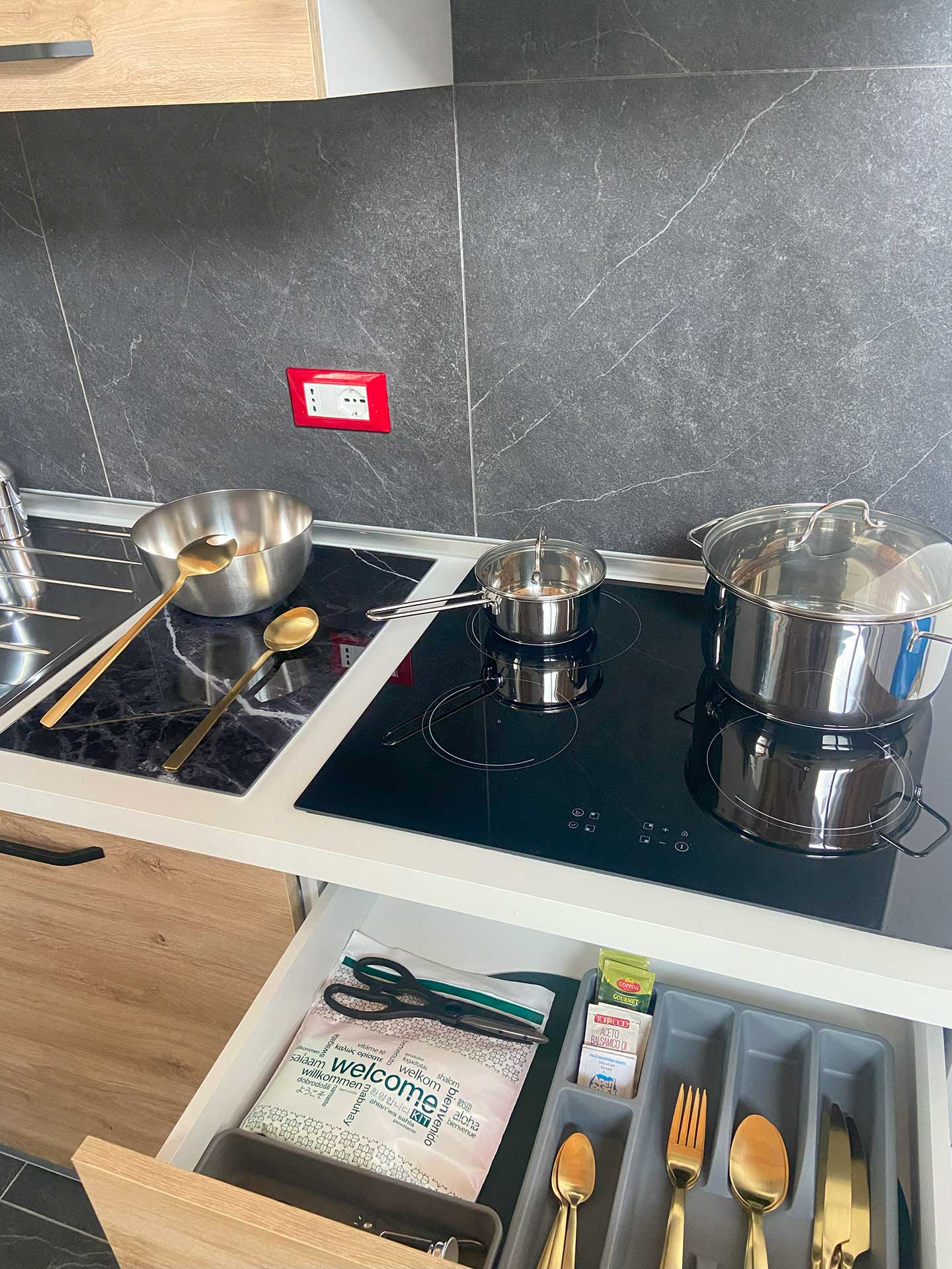 Le cucine sono complete di posate, rotolo di cucina, forbici, bicchieri, piatti, moka, bollitore, coltello da pane, frigorifero, pattumiera, tovaglia, padelle e pentole. È inoltre fornito un kit cortesia con sapone per i piatti, spugna, panno e una busta per la spazzatura.